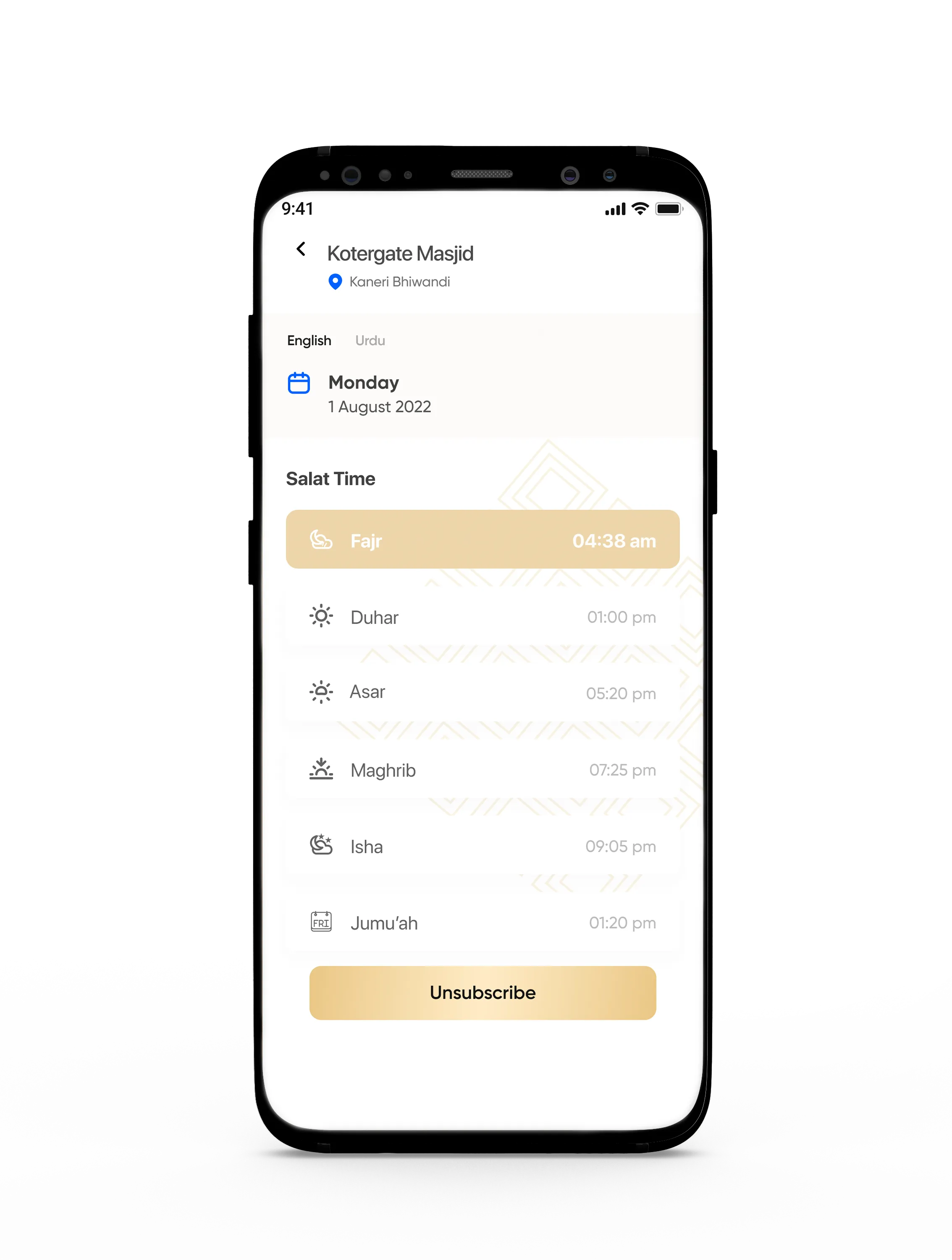 Accurate azan and salat times as set by your Masjid, synced and updated immediately.